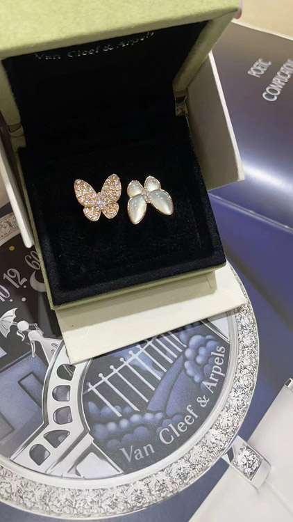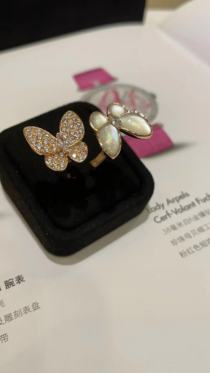 Van Cleef & Arpels White Mother-of-Pearl Diamond Butterfly Rose Gold Ring-3734