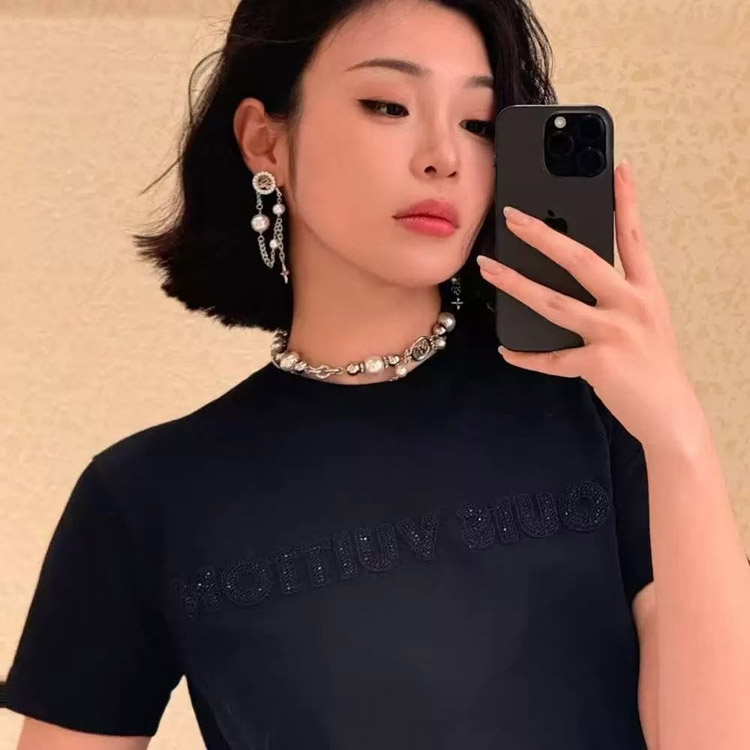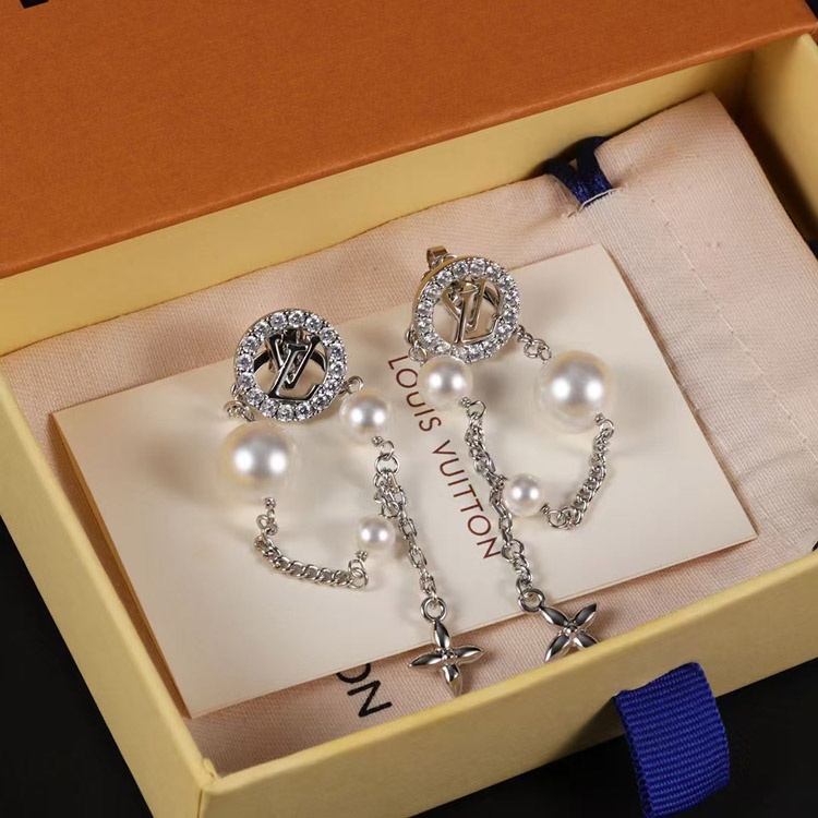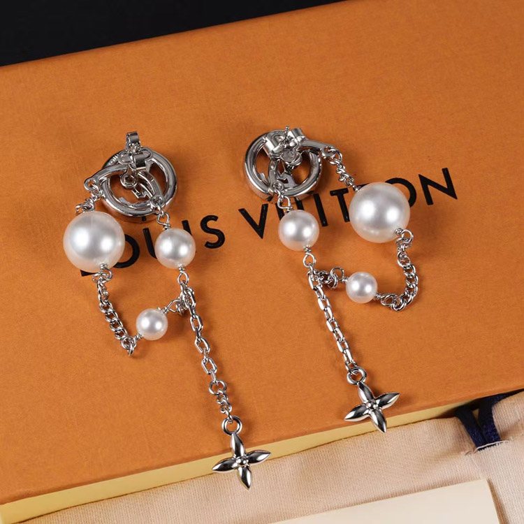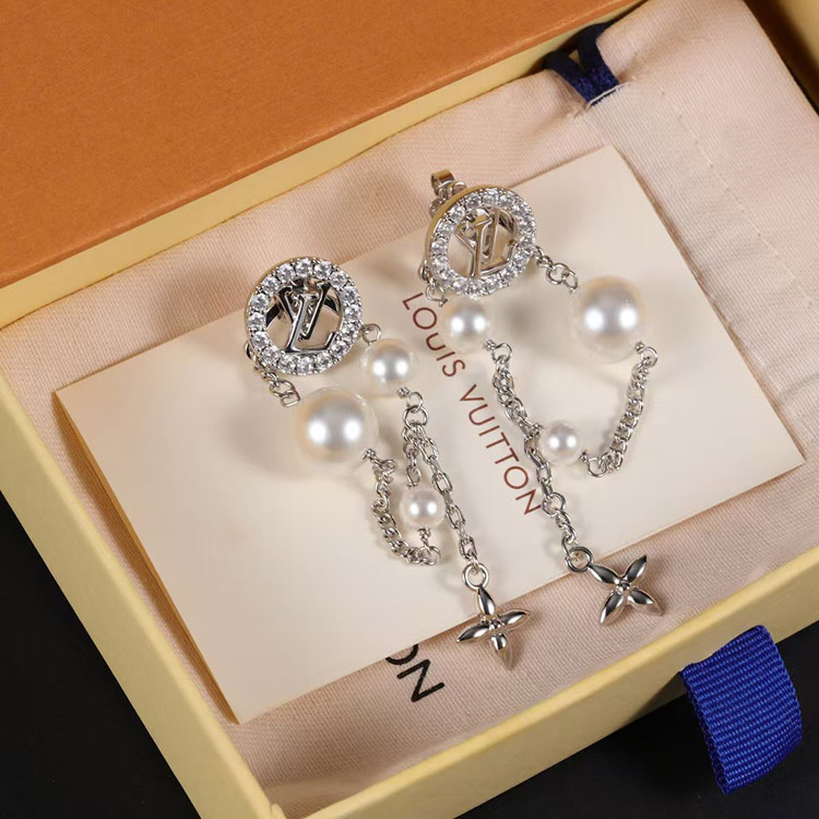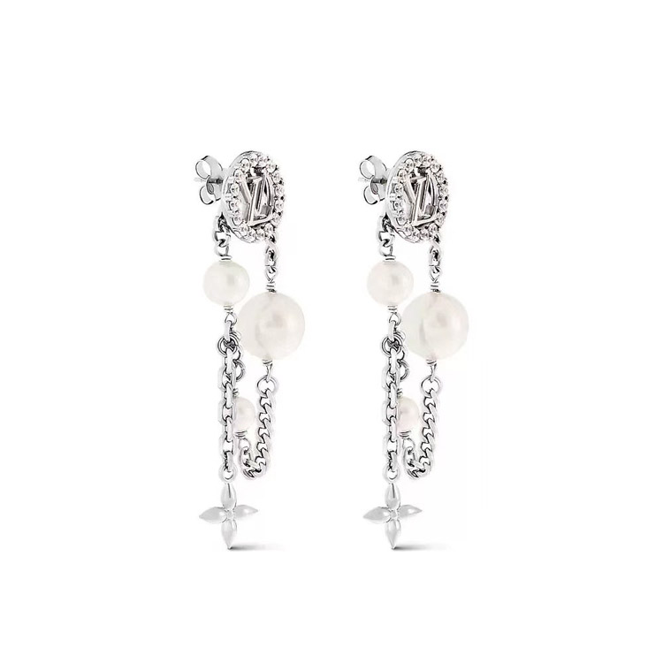 Louis Vuitton LV silver letter diamond pearl tassel earrings-3865